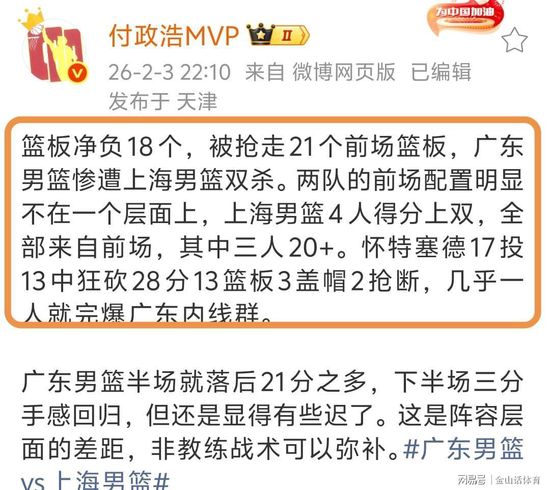 赛后,媒体人付政浩MVP社媒发文表示:篮板净负18个,被抢走21个前场篮板,广东男篮惨遭上海男篮双杀。两队的前场配置明显不在一个层面上,上海男篮4人得分上双,全部来自前场,其中三人20+,怀特塞德28分15篮板3盖帽2抢断,几乎一人就完爆广东内线群……